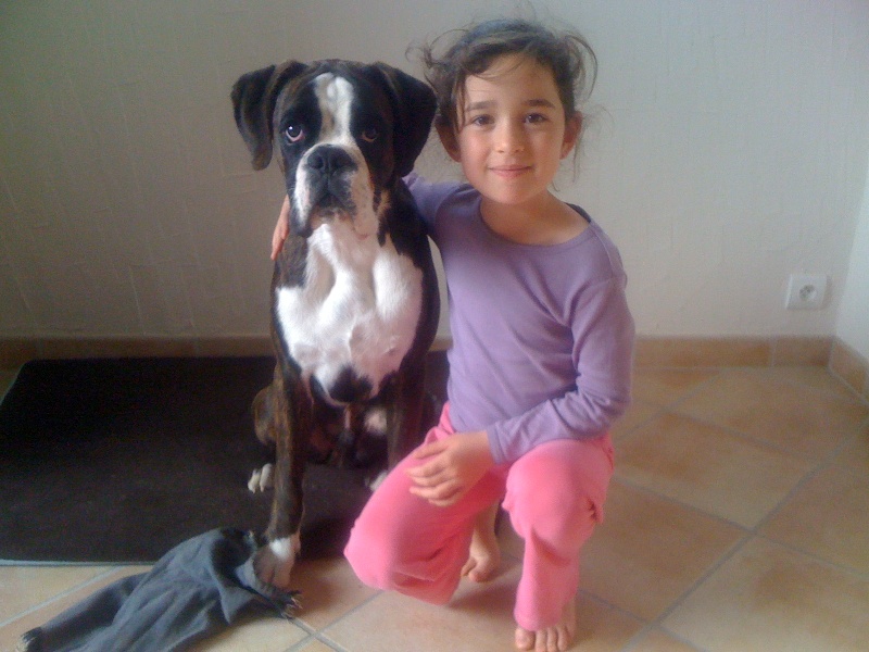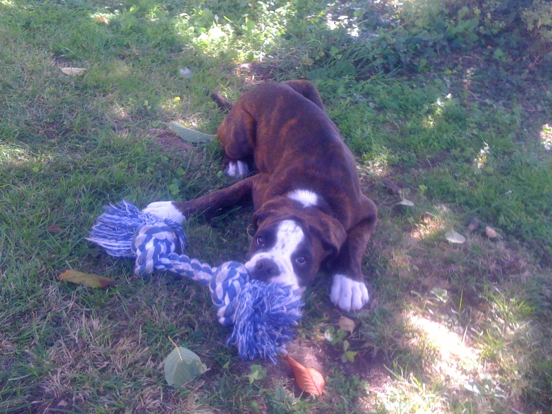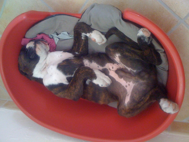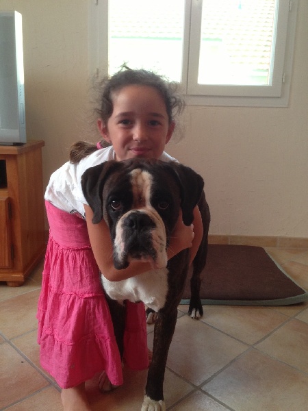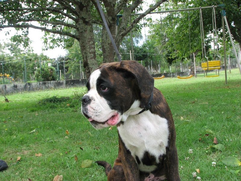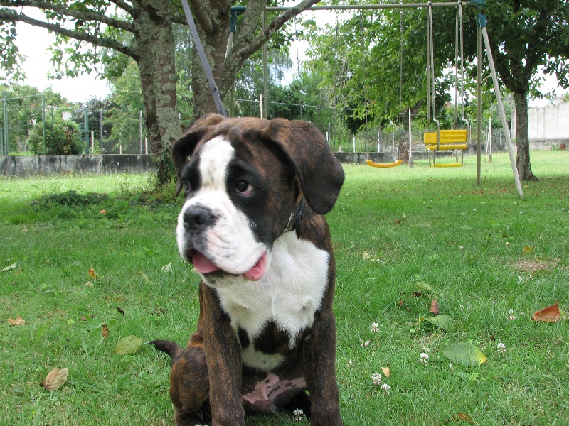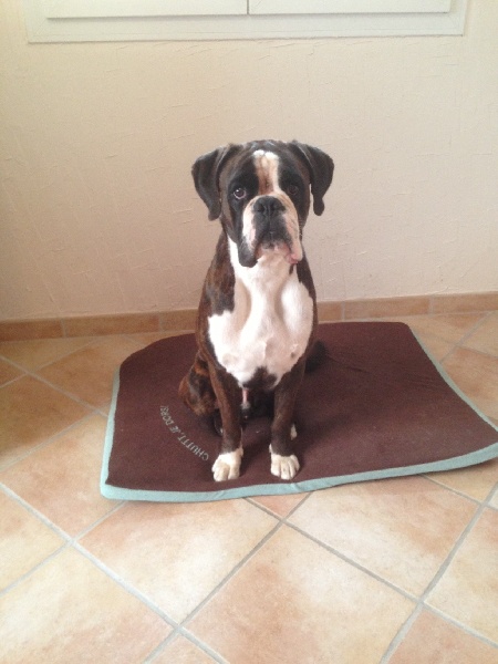 25 mois. Grand, très fort et masculin. Exl ossature et substance. Bringé rouge marqué en blanc. Tête typée crane légerement large, stop très bien marqué, yeux marrons paupières dépigmentées. Museau large et profond. Exc prognatisme. Denture large alignée. Exc cou grand très marqué, Exc ligne sup/inf. TB largeur et profondeur de poitrine. TB ang AV/AR. B. allures. Chien très compact.